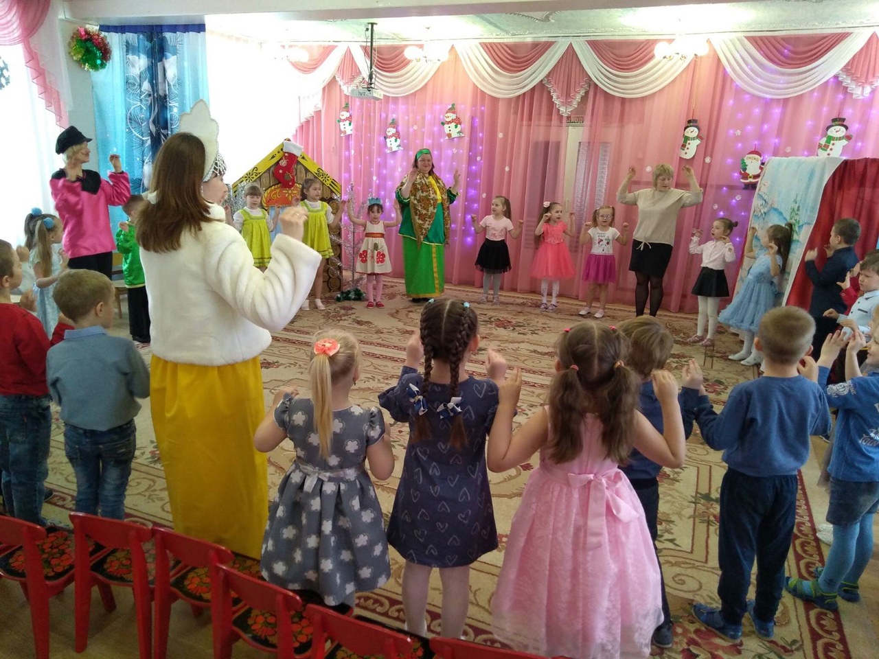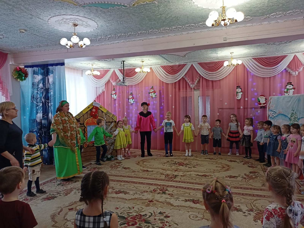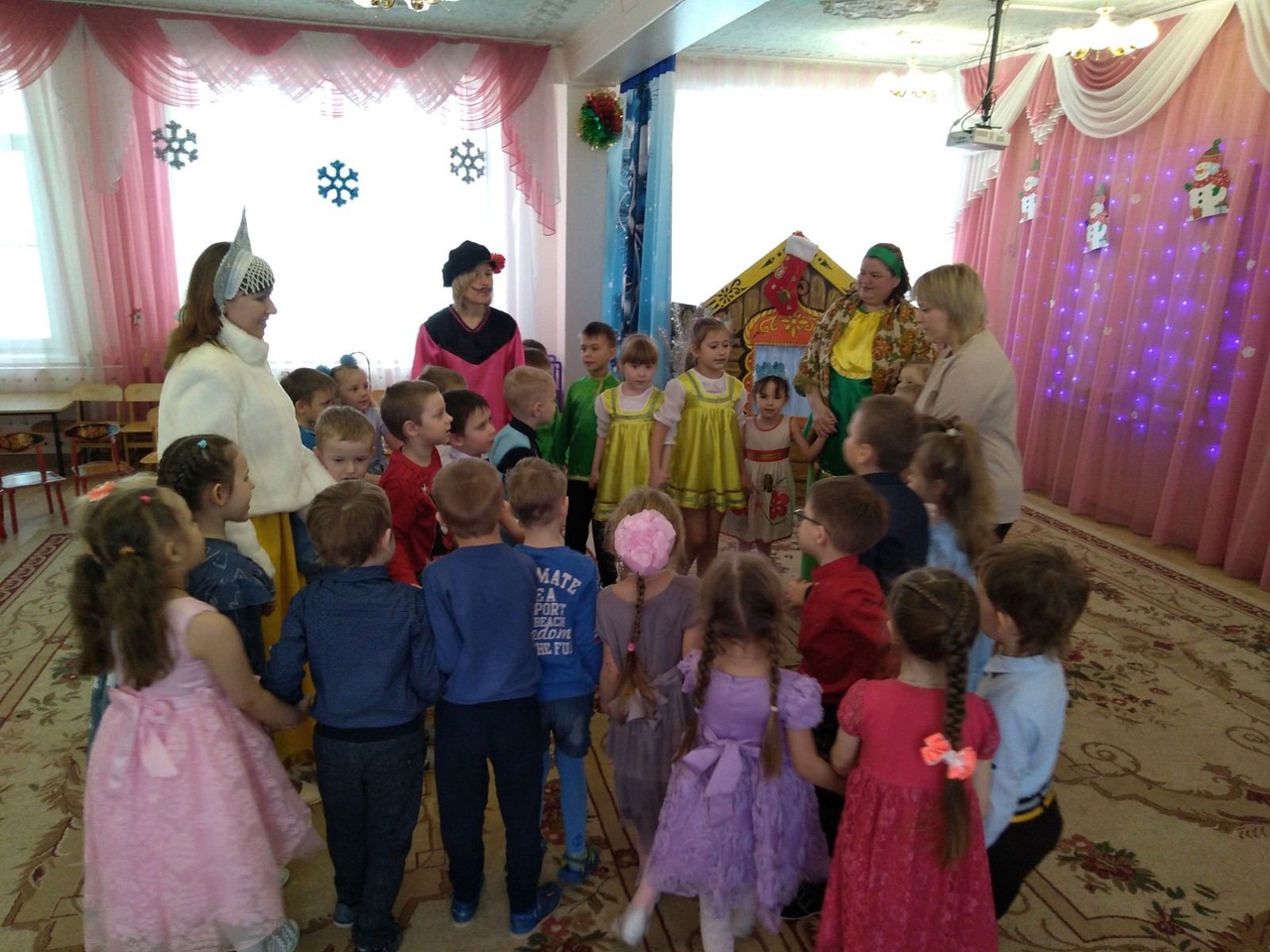 Мероприятие было организовано с целью знакомства детей со старинными русскими традициями, воспитания чувства коллективизма, дружбы, радости общения. Эмоциональный настрой подарили детям «ряженные» сотрудники детского сада. В гости к ребятам пришли сказочные персонажи Снеговик, Василиса и др.
