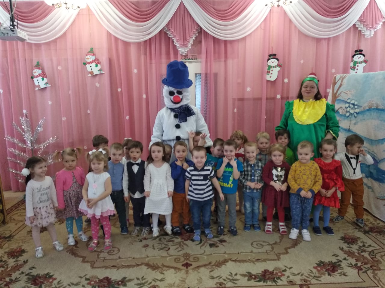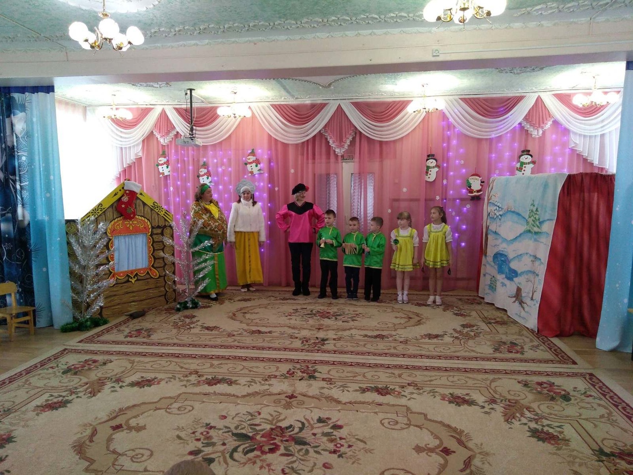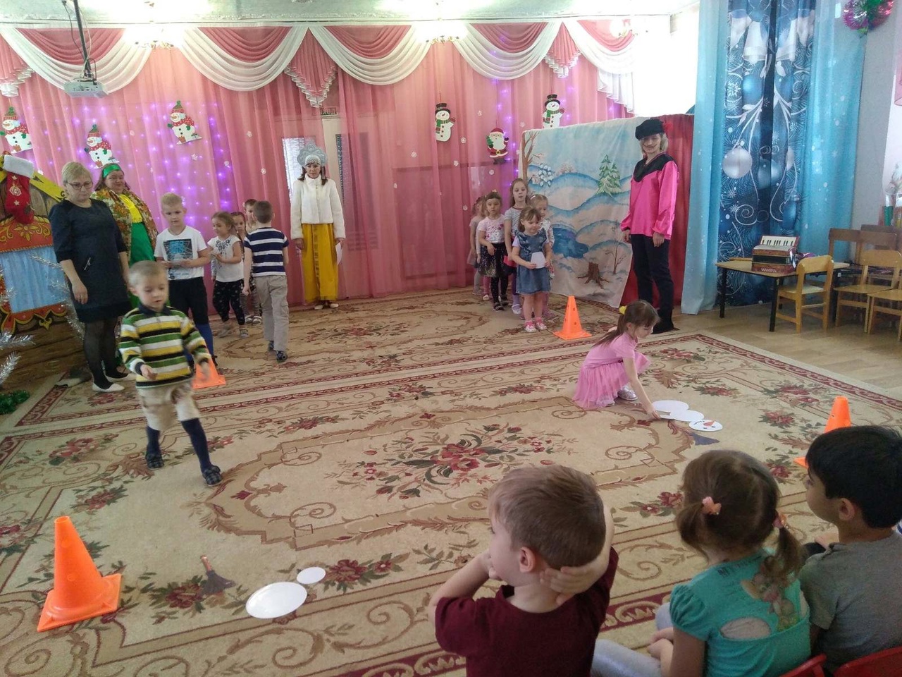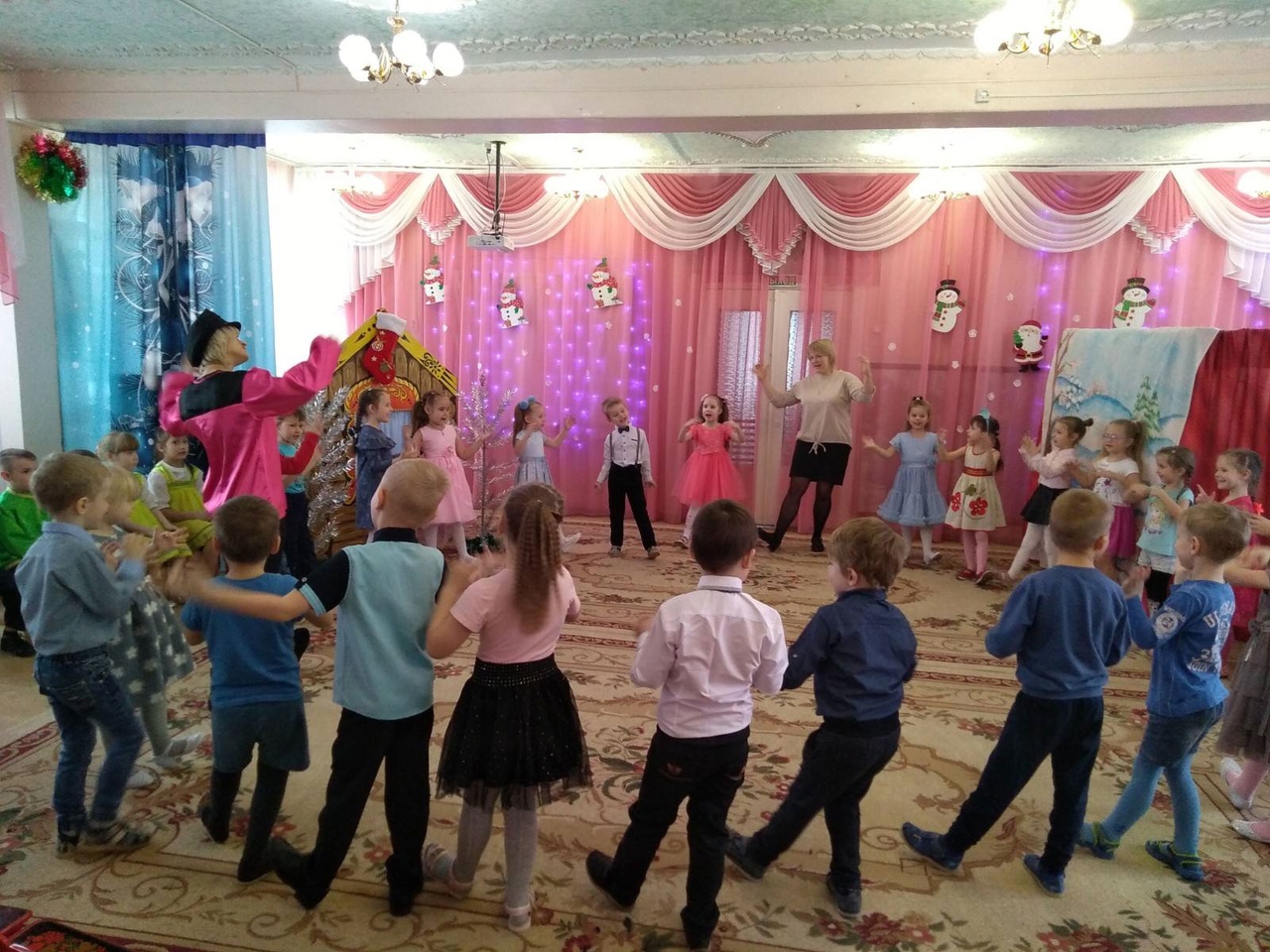 Мероприятие было организовано с целью знакомства детей со старинными русскими традициями, воспитания чувства коллективизма, дружбы, радости общения. Эмоциональный настрой подарили детям «ряженные» сотрудники детского сада. В гости к ребятам пришли сказочные персонажи Снеговик, Василиса и др.