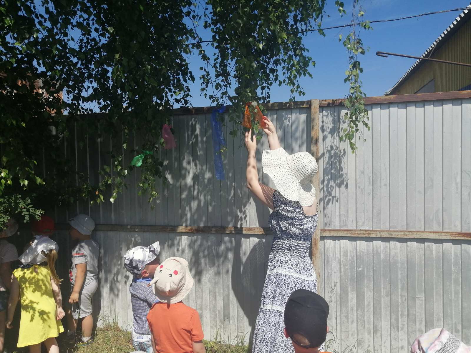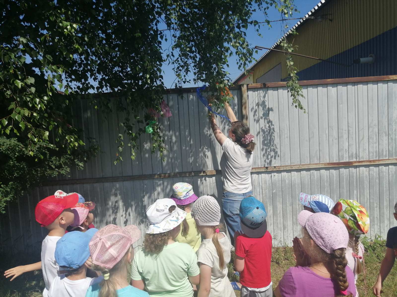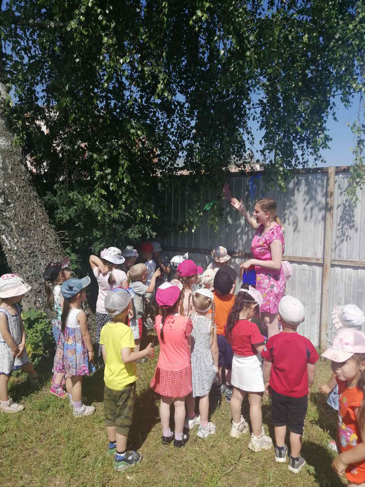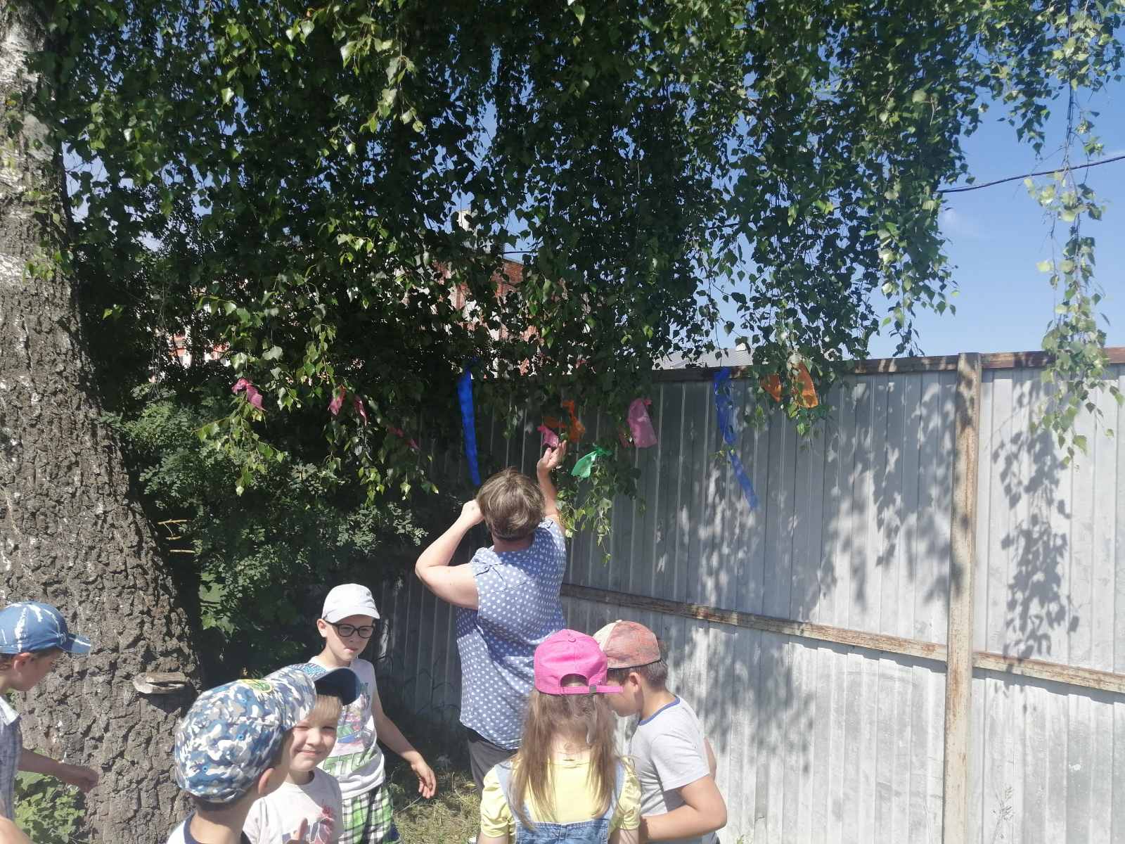 После рассказа воспитателя о белоствольной красавице, которая олицетворяет собой русскую душу: чистую, летящую, щедрую, ребята вместе с воспитателями рассмотрели берёзу на территории участка и повесили на ее веточки разноцветные ленты.