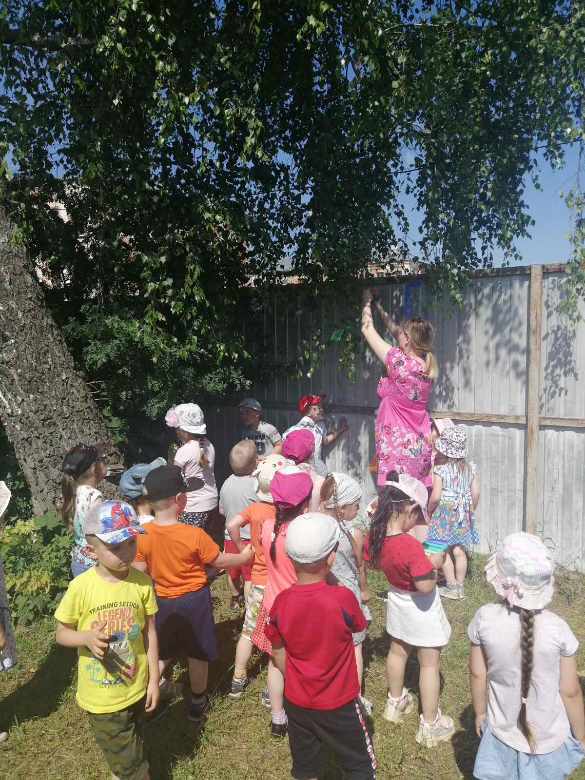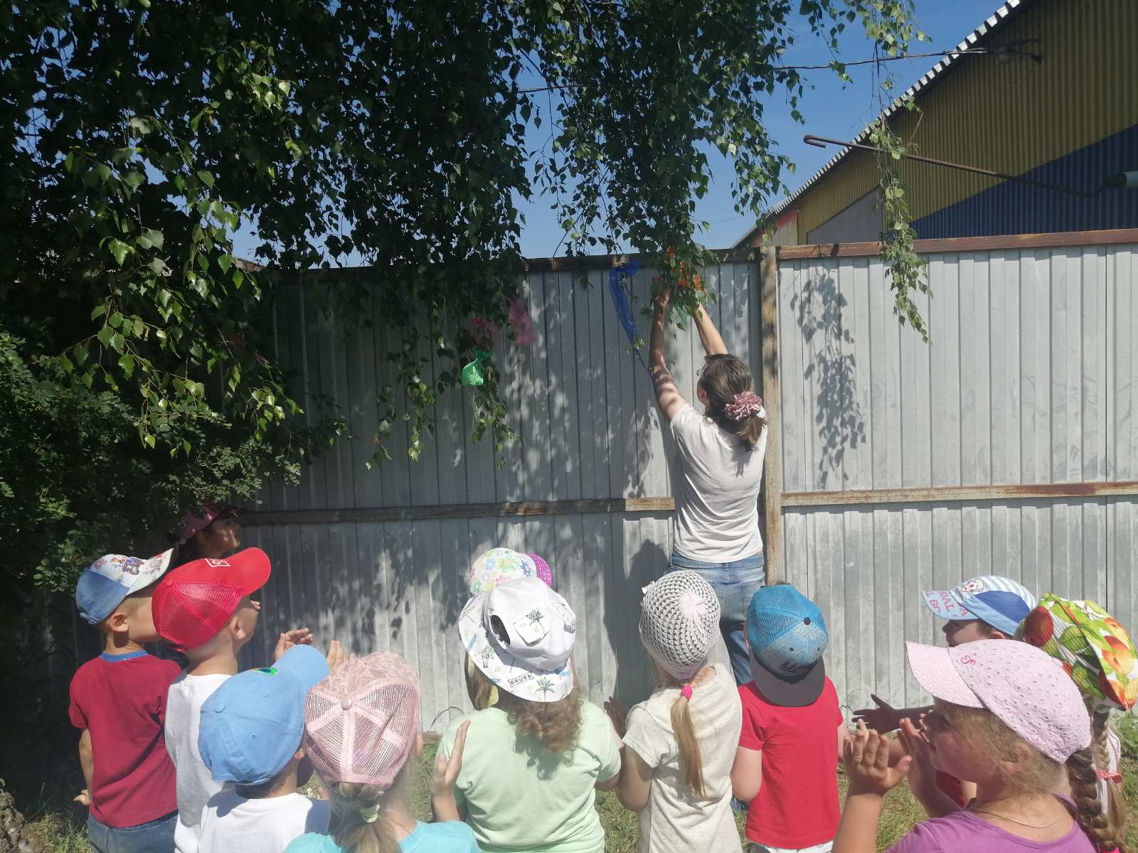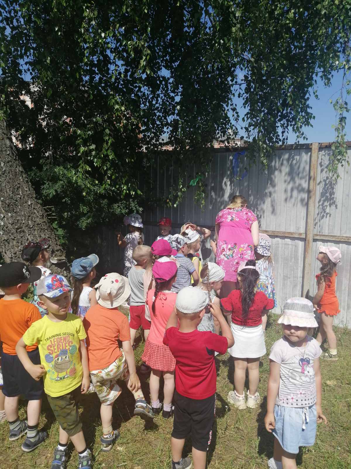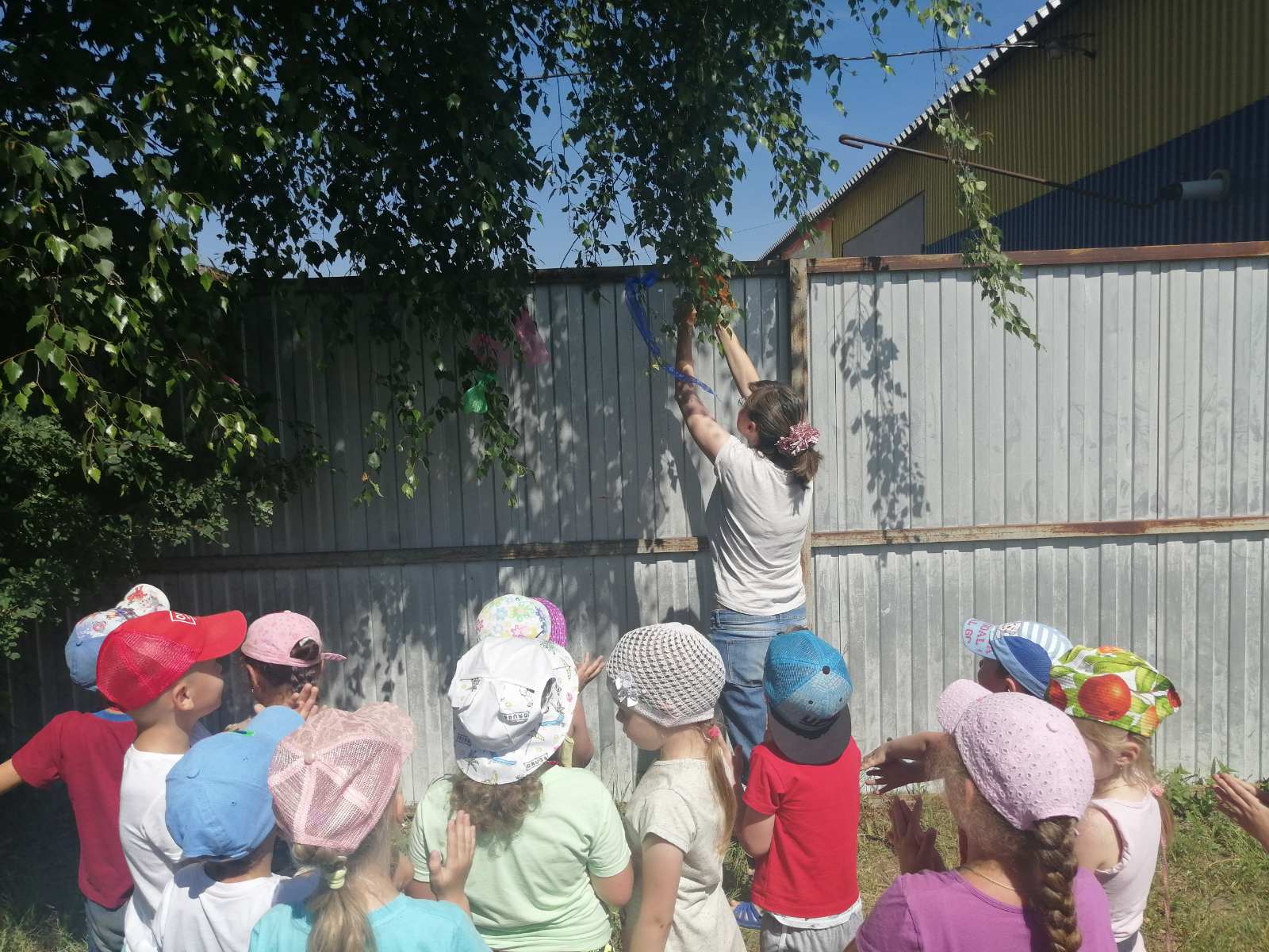 После рассказа воспитателя о белоствольной красавице, которая олицетворяет собой русскую душу: чистую, летящую, щедрую, ребята вместе с воспитателями рассмотрели берёзу на территории участка и повесили на ее веточки разноцветные ленты.