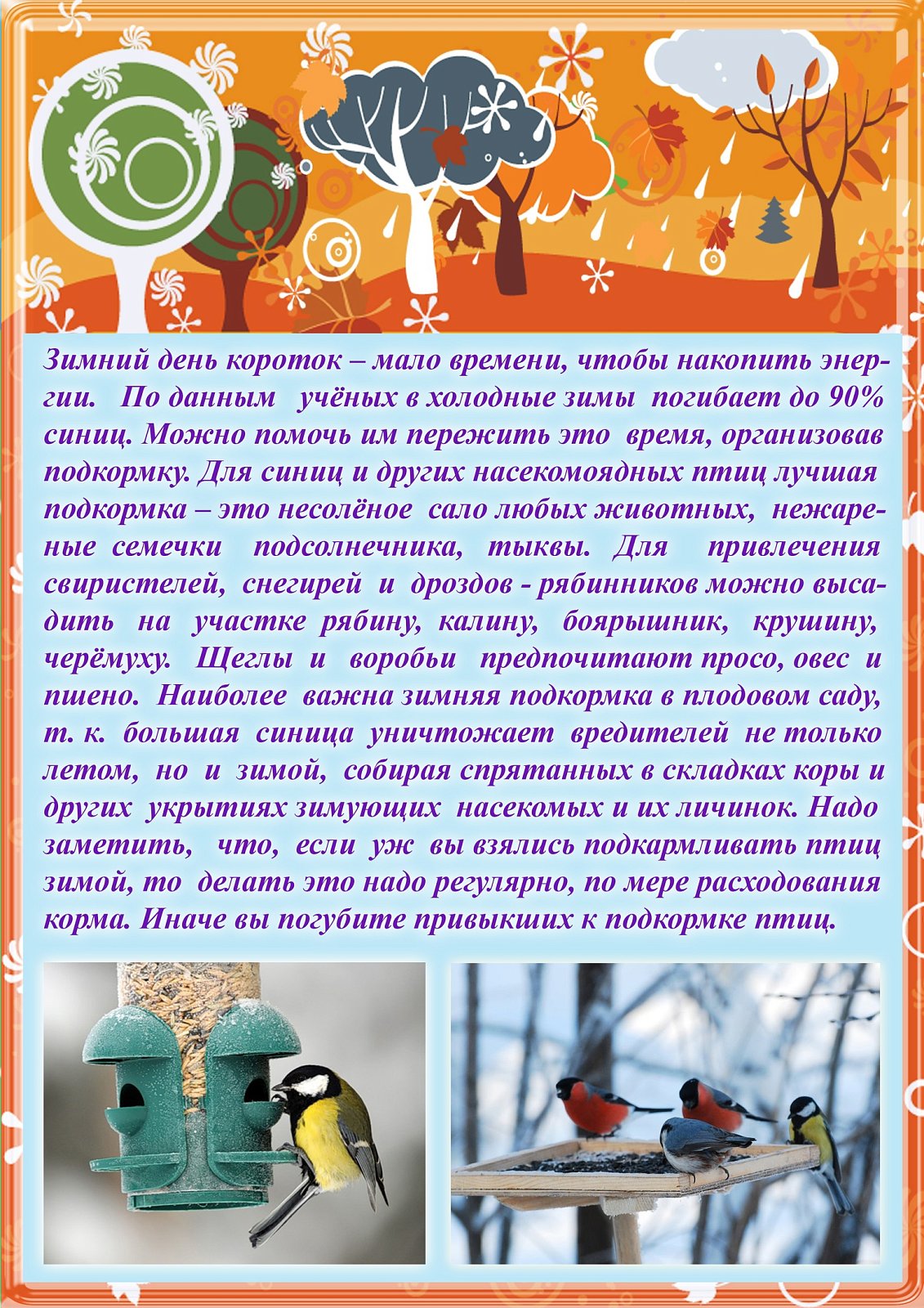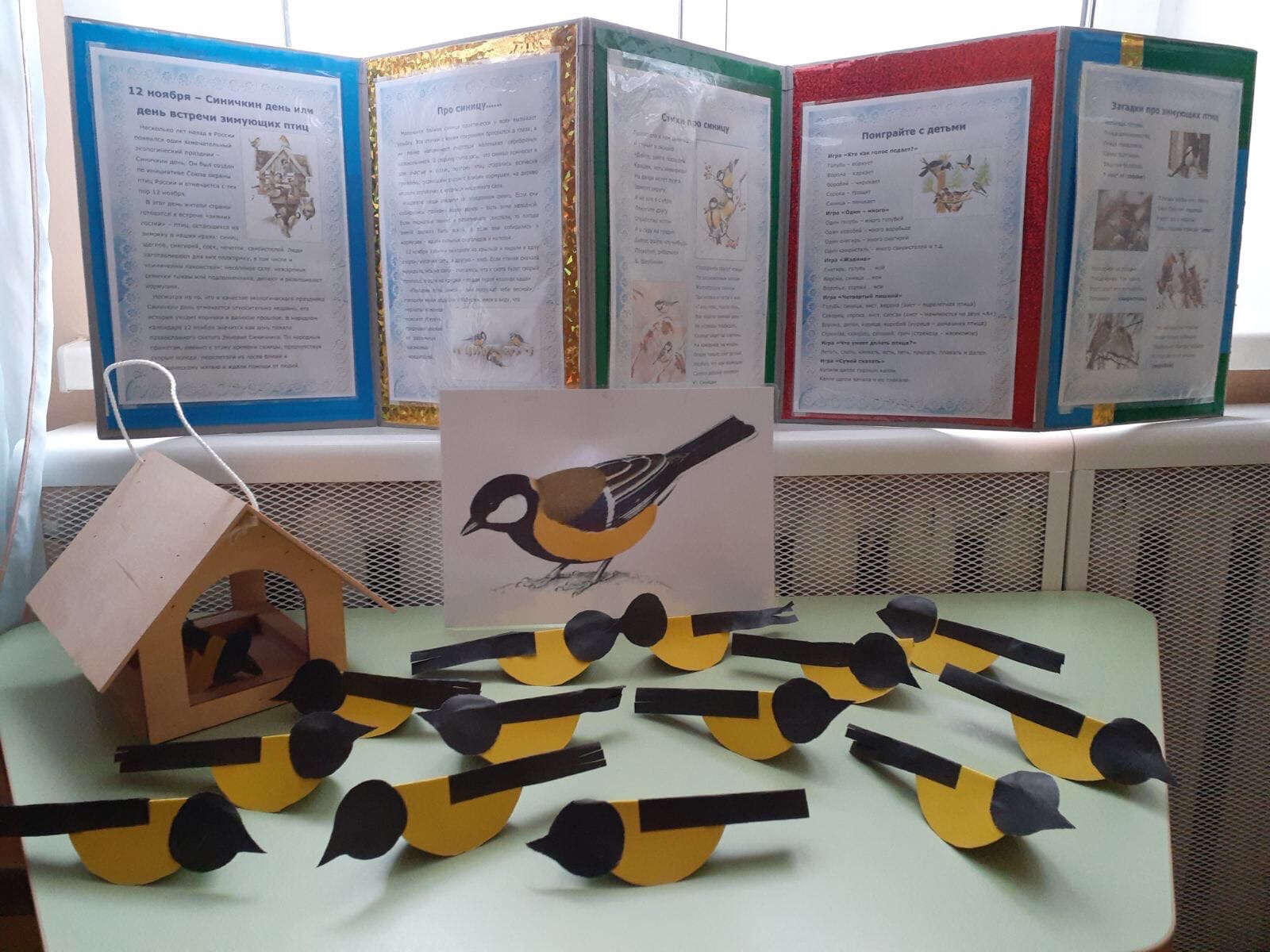 Осень близиться к своему завершению. Вот и наступил последний осенний месяц. С давних пор на Руси 12 ноября отмечался Синичкин день, т. е., день встречи зимующих птиц. Люди готовили кормушки, читали стихи про птиц, загадывали загадки, играли и просто любовались зимними птахами. Ребята приготовили угощение для пернатых, изготавливали подделки синичек.