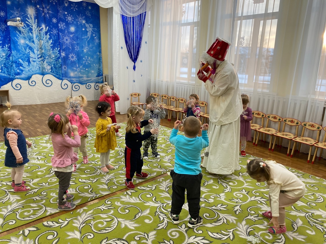 Снеговик пришел не с пустыми руками, он приготовил для детишек, много веселых игр, танцев, песен. Дети веселились от души и были очень счастливы, что именно к ним пришел Снеговик в свой день рождения.