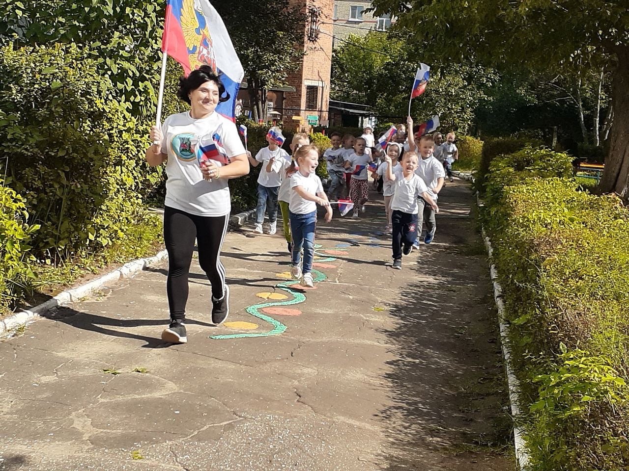 ????????Инструктор по физической культуре Никифорова Анастасия Валерьевна организовала с ребятами младших групп забег «Мой флаг», со старшими дошкольниками - эстафету «Передай мой флаг». На станции «Музыкальная» ребята узнали о главной песне нашей страны - гимне, а на станции «Познавайка» - о том, что обозначает каждый цвет флага