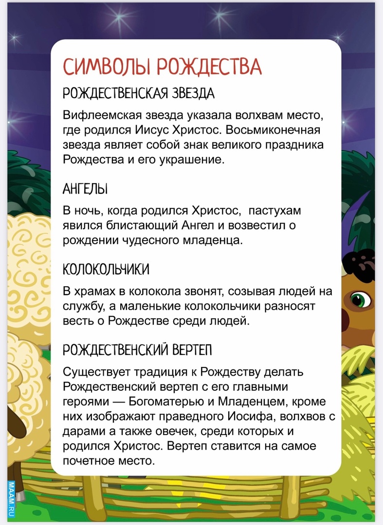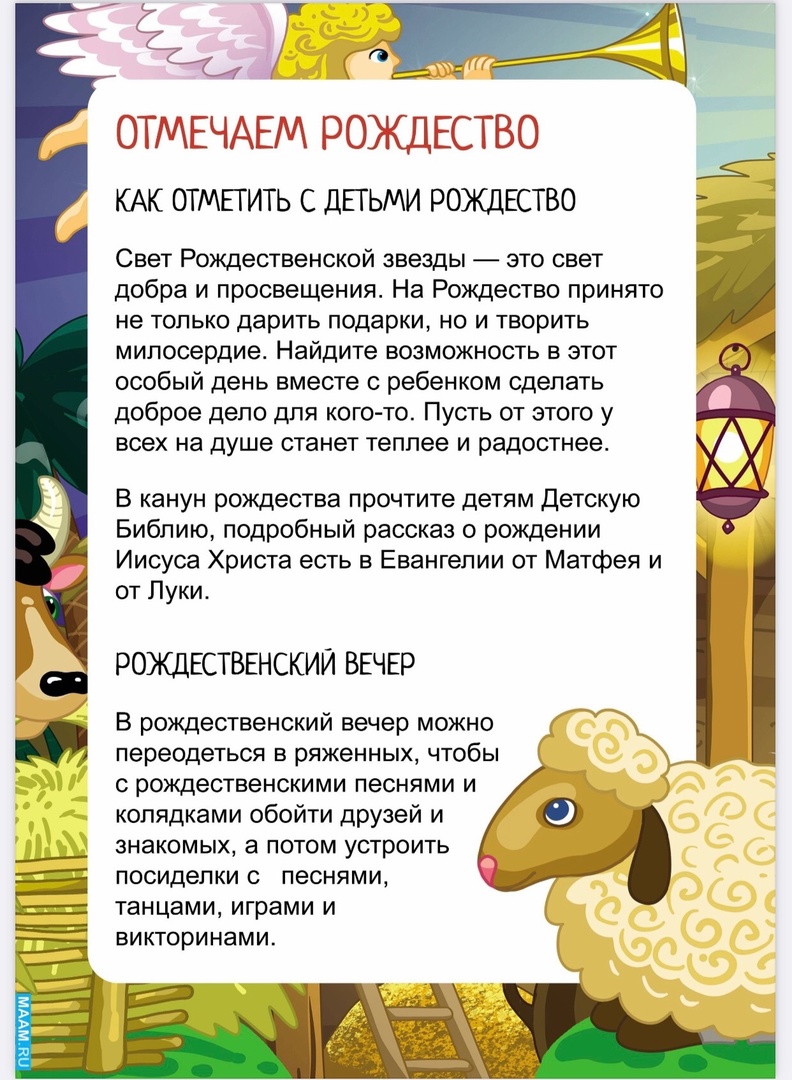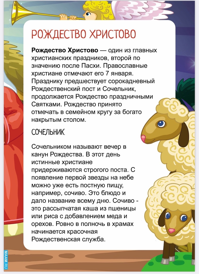 Рождество Христово — один из главных христианских праздников, второй по значению после Пасхи. Православные христиане отмечают его 7 января. Празднику предшествует сорокадневный Рождественский пост и Сочельник, продолжается Рождество праздничными Святками. Рождество принято отмечать в семейном кругу за богато накрытым столом.