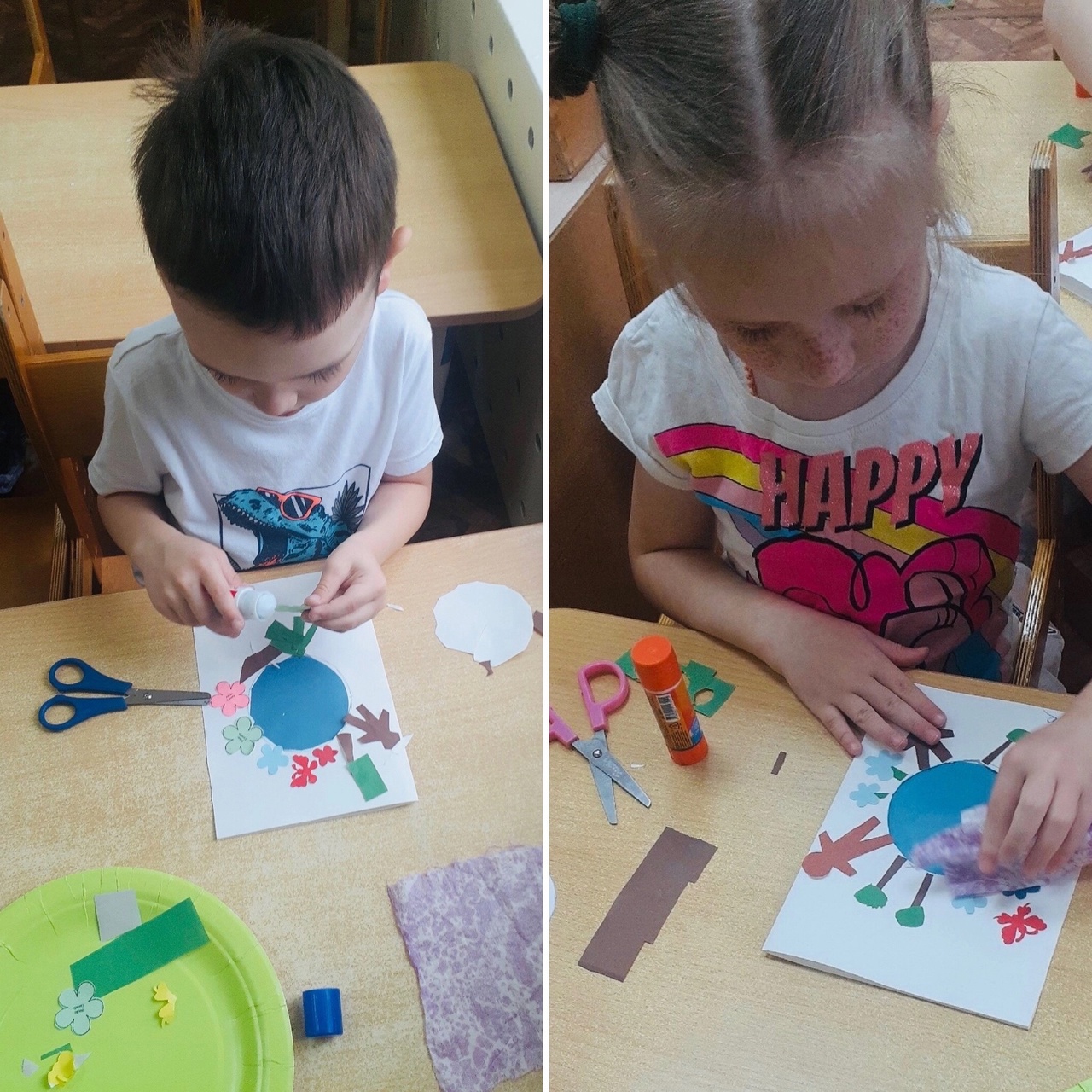 В практической деятельности дети старшей группы «Колокольчик» изобразили «Жизнь на планете Земля» с помощью аппликации, а потом оформили выставку открыток «Сохраним нашу планету» (воспитатель -Корнева Валентина Николаевна)