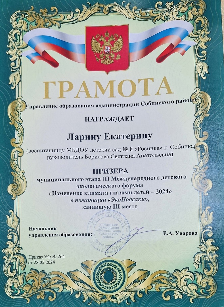 Ларина Екатерина -ПРИЗЁР (3 место) муниципального этапа III Международного детского экологического форума "Изменение климата глазами детей-2024" в номинации "ЭкоПоделки".