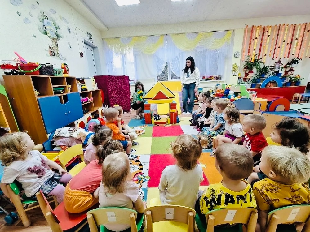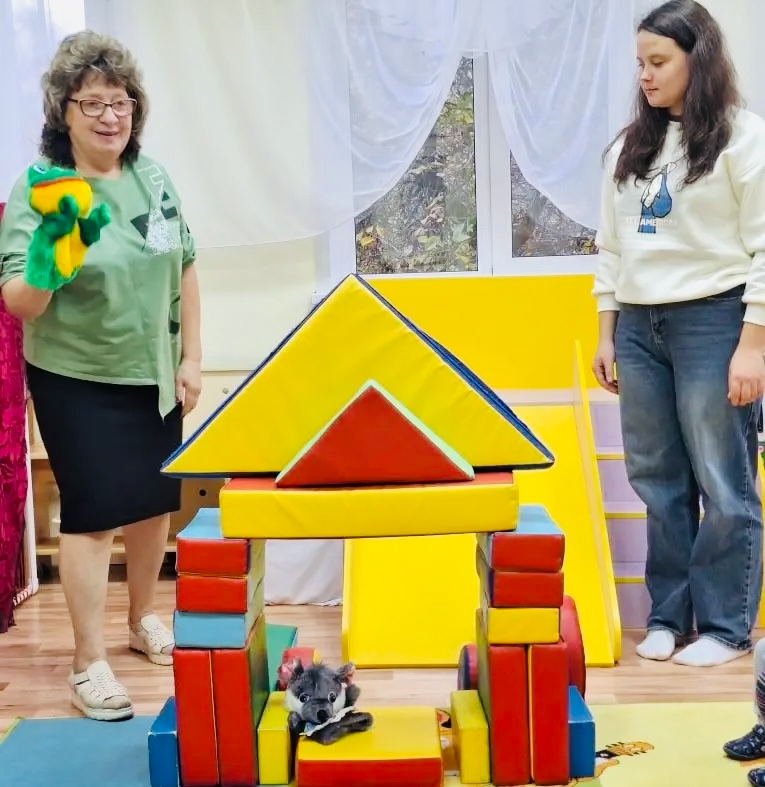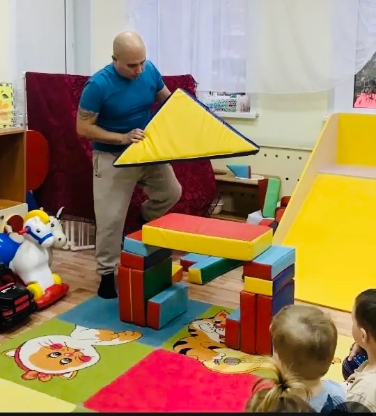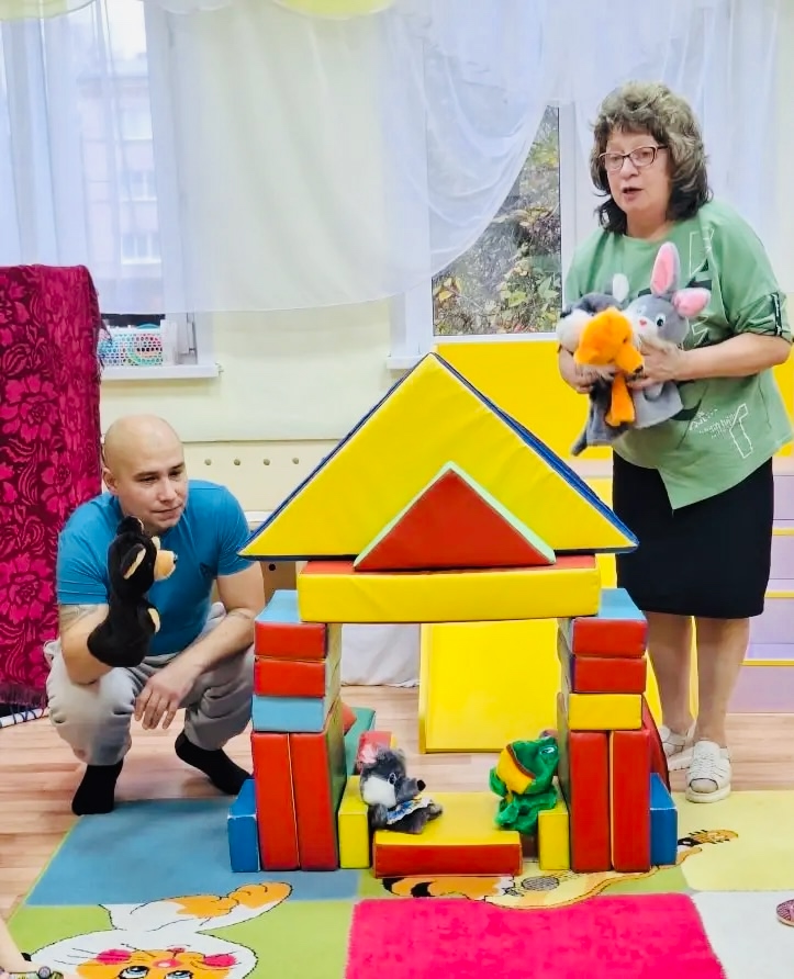 Маштачков Денис Владимирович учил детей строить домик -теремок их крупного строительного материала, а затем ребята посмотрели театрализацию сказки «Теремок» с участием Дениса Владимировича.